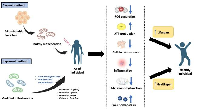 Предполагаемые эффекты пересадки митохондрий пожилым пациентам: снижение продукции активных форм кислорода, увеличение синтеза АТФ, уменьшение старения клеток, воспаления и нарушений энергообмена Hua Phua, Yan, Soh / Aging and Disease, 2024