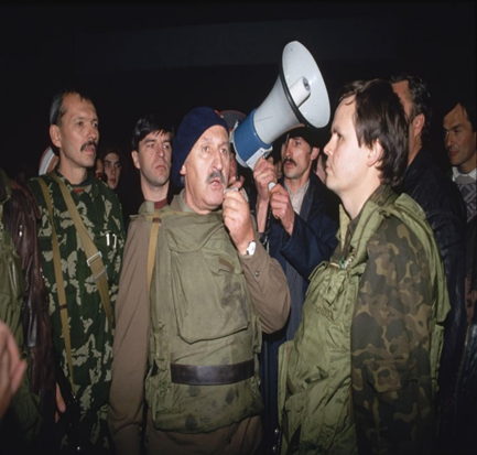 Генерал А.М. Макашов, с автоматом в руках, облаченный в пятнистую полевую форму — в бронежилете, черном берете «ультра», в окружении вооруженных боевиков врывается в законодательный орган российской столицы. В мэрии Москвы, захваченной головорезами генерала А.М. Макашова, «были расстреляны два солдата, отказавшихся перейти на сторону мятежников» («Голос», № 41, 11-17 октября 1993 г.)