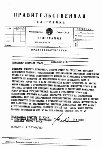 В конце августа Верховным Советом РСФСР была сформирована рабочая группа для поездки в регионы, прежде всего проявившие на уровне тех или иных структур, поддержку ГКЧП. В итоге на основании полученной телеграммы я значительное время провел в Краснодарском крае и Кабардино-Балкарии. И с учетом политических, кадровых и имущественных решений, принимавшихся на основании Указов Президента СССР и РСФСР, подтверждаю, что вопрос об обновлении представительной власти в масштабе страны звучал неоднократно.