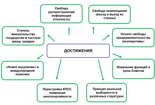Под ограничением степени вмешательства в частную жизнь граждан подразумевается возвращение лиц, осужденных по политической статье, прекращение глушения нежелательных в СССР радиостанций. Свобода перемещения означала не только право возвращения из зарубежной страны, но и возможности выезда за рубеж. Принцип реальной выборности в различных структурах нанес удар по взяточничеству в южных республиках. «Новое мышление» в международной политике и приоритет общечеловеческих ценностей разрушили «железный занавес» между СССР и Западом.