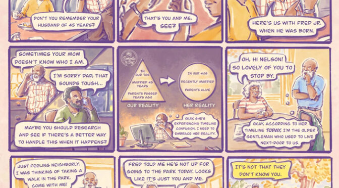 Комикс проекта DementiaByDay, изображающий распространенную ситуацию при болезни Альцгеймера. Жена забыла своего мужа и принимает его за отца. Она еще и потеряла ориентировку во времени, думая, что им с ее пожилым мужем лишь немного за тридцать. По совету реабилитологов муж прекращает попытки переубедить жену — ее мозг уже не способен вернуться в реальность. Вместо этого он притворяется пожилым джентльменом, который был другом их семьи в молодости. Эта тактика успешна: он, по крайней мере, может вывести собственную жену на прогулку, сославшись на занятость мужа, с которым «говорил» только что. Рисунок с сайта dementiabyday.com